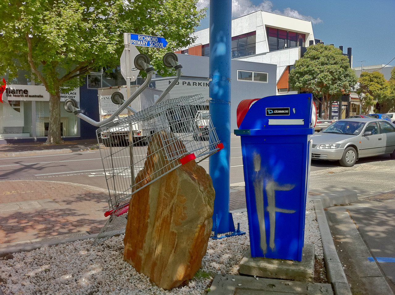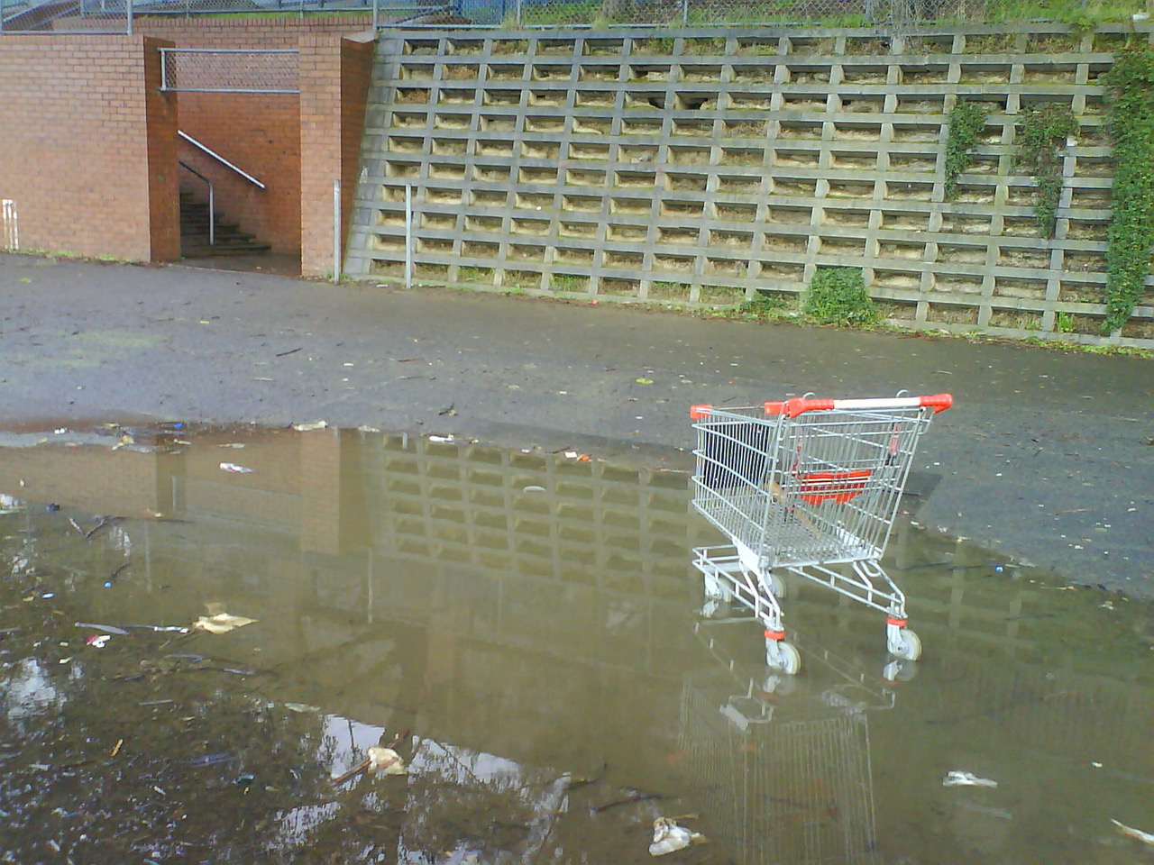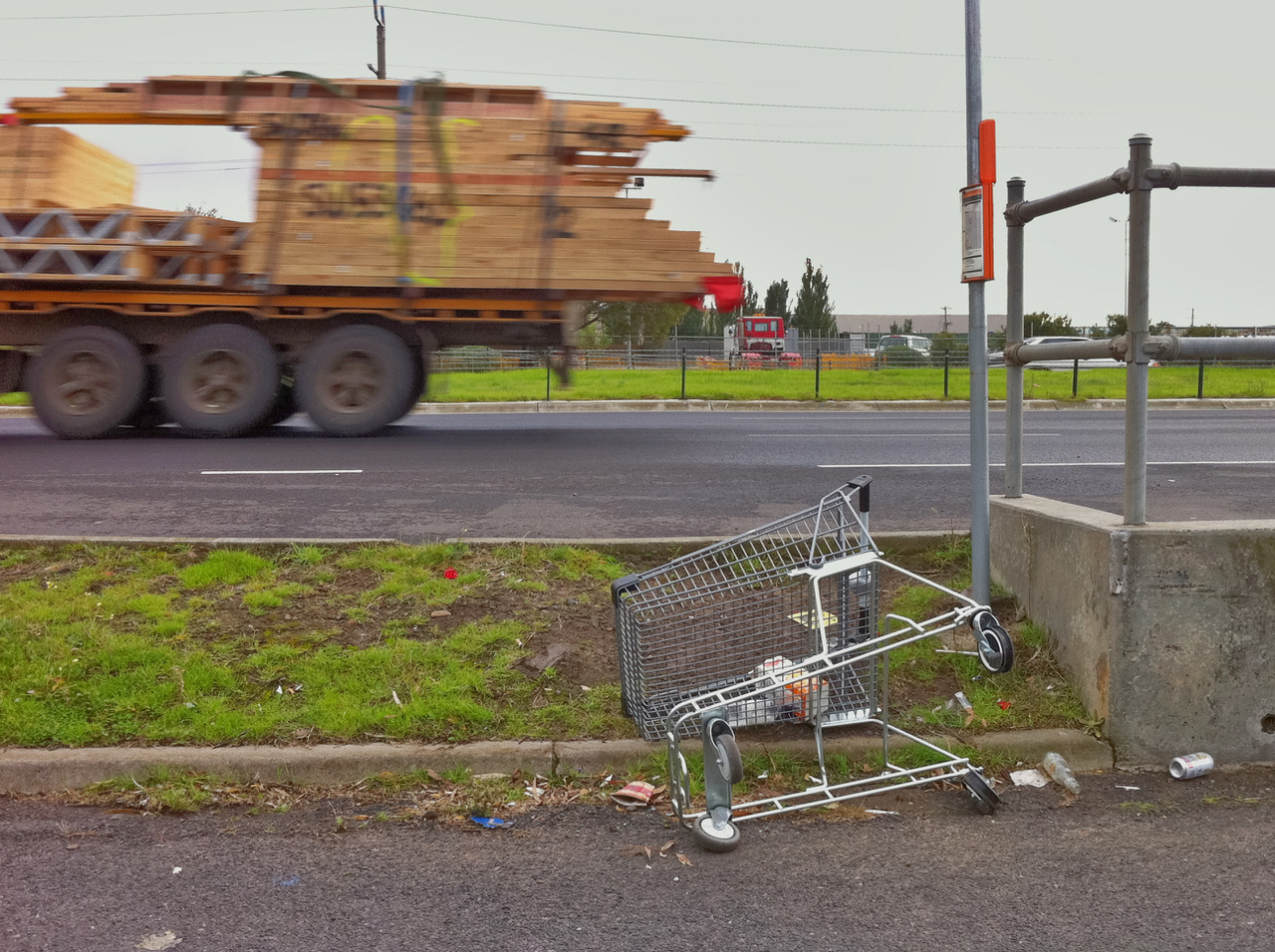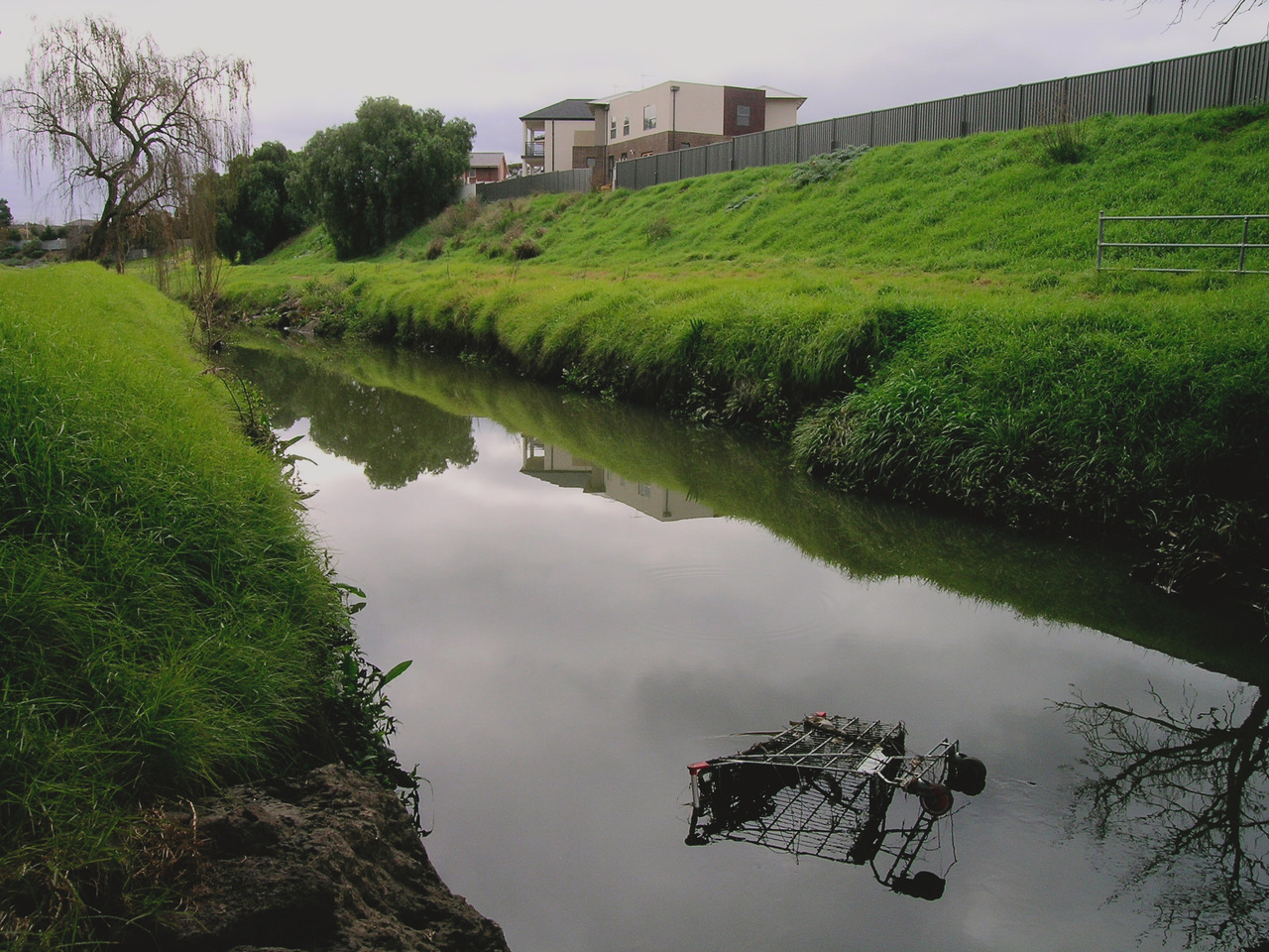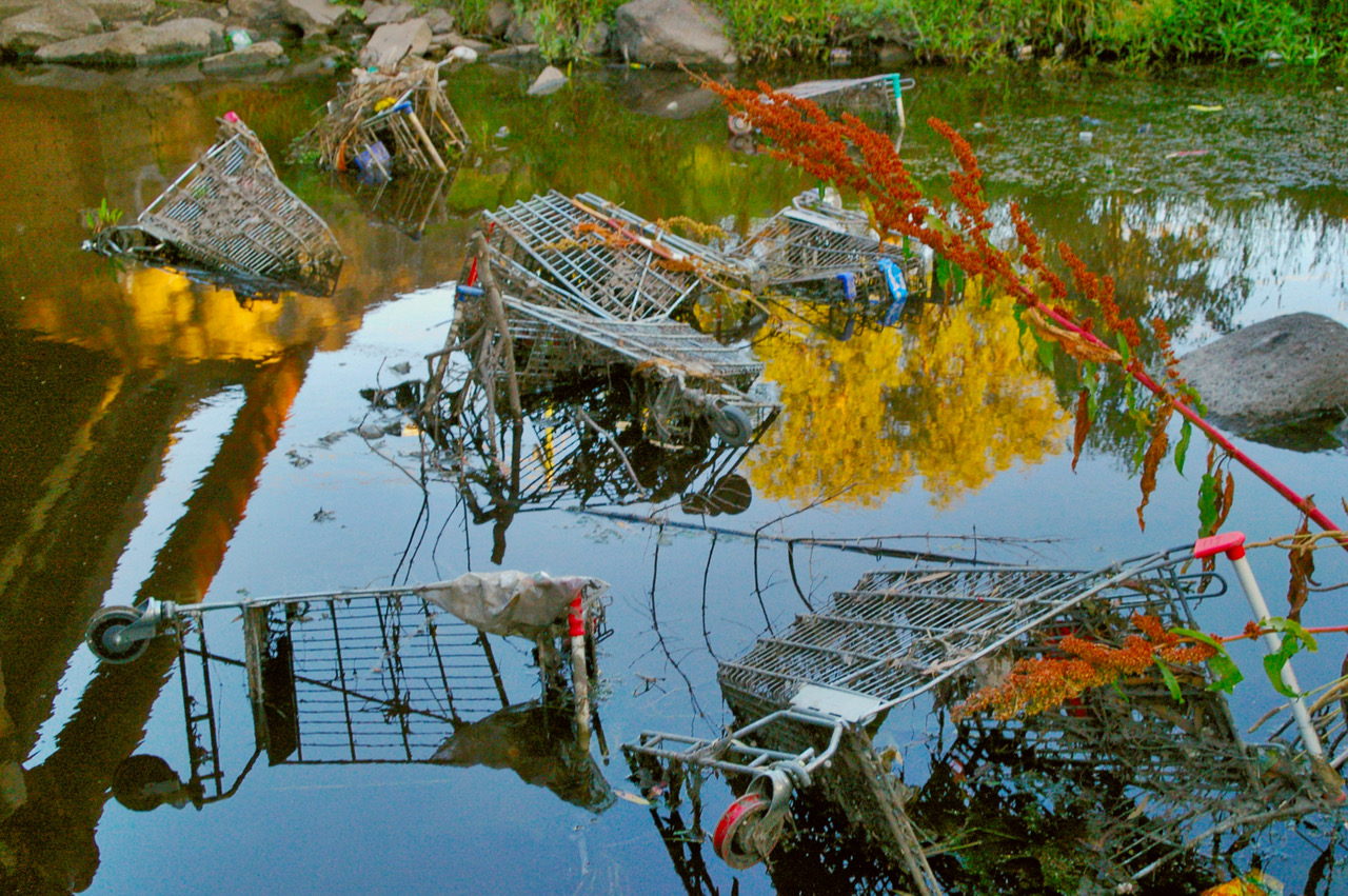 The images of shopping carts submerged in waterways, overgrown with vegetation, and set against industrial backgrounds speak to environmental consequences of consumer culture. These once-pristine tools of commerce, now rusting in streams or lying amid weeds, become artificial artefacts in natural settings—a stark reminder of our disposable economy’s environmental impact. A shopping cart in murky water hints at both literal pollution and the muddied waters of consumer society.